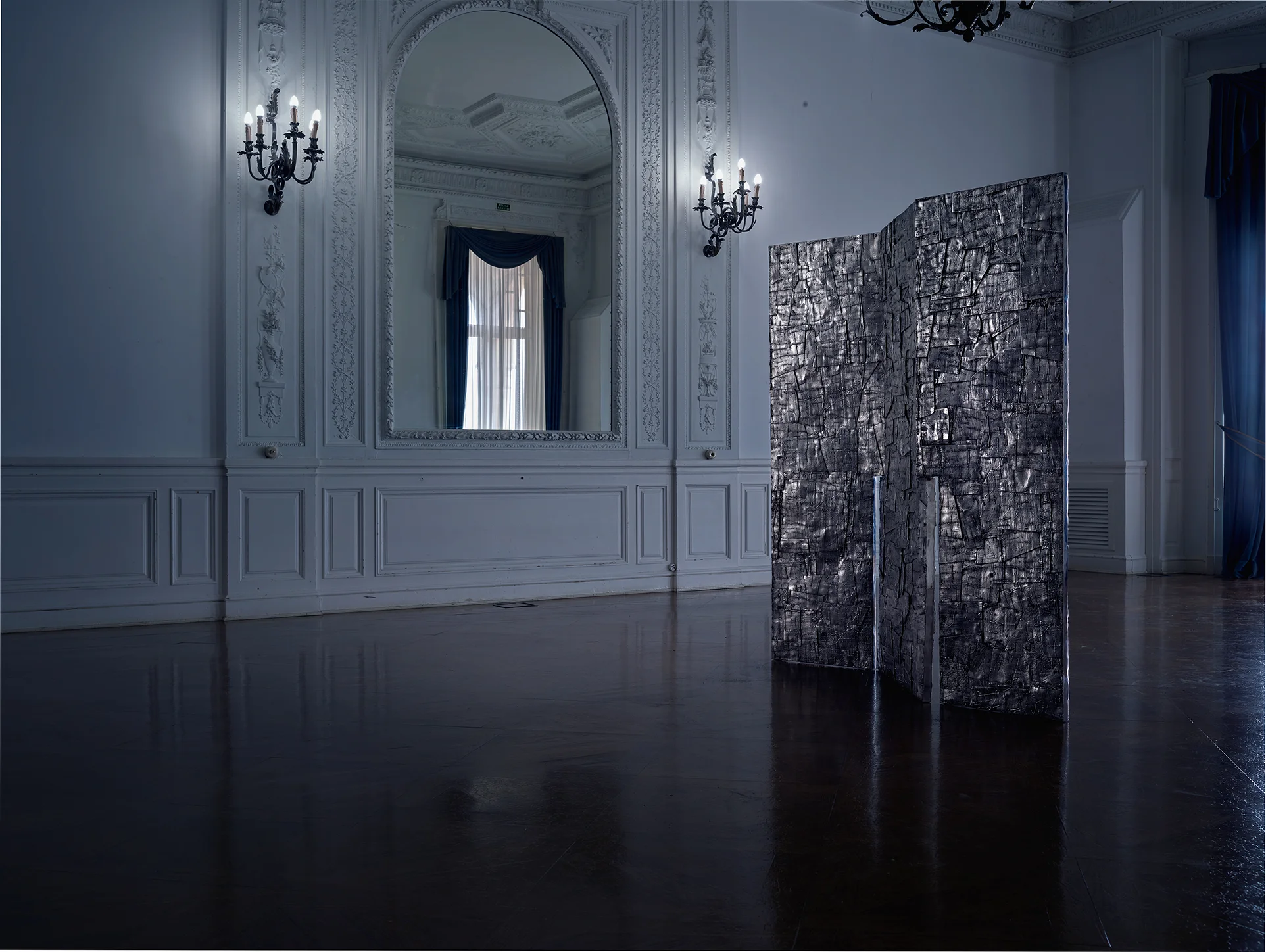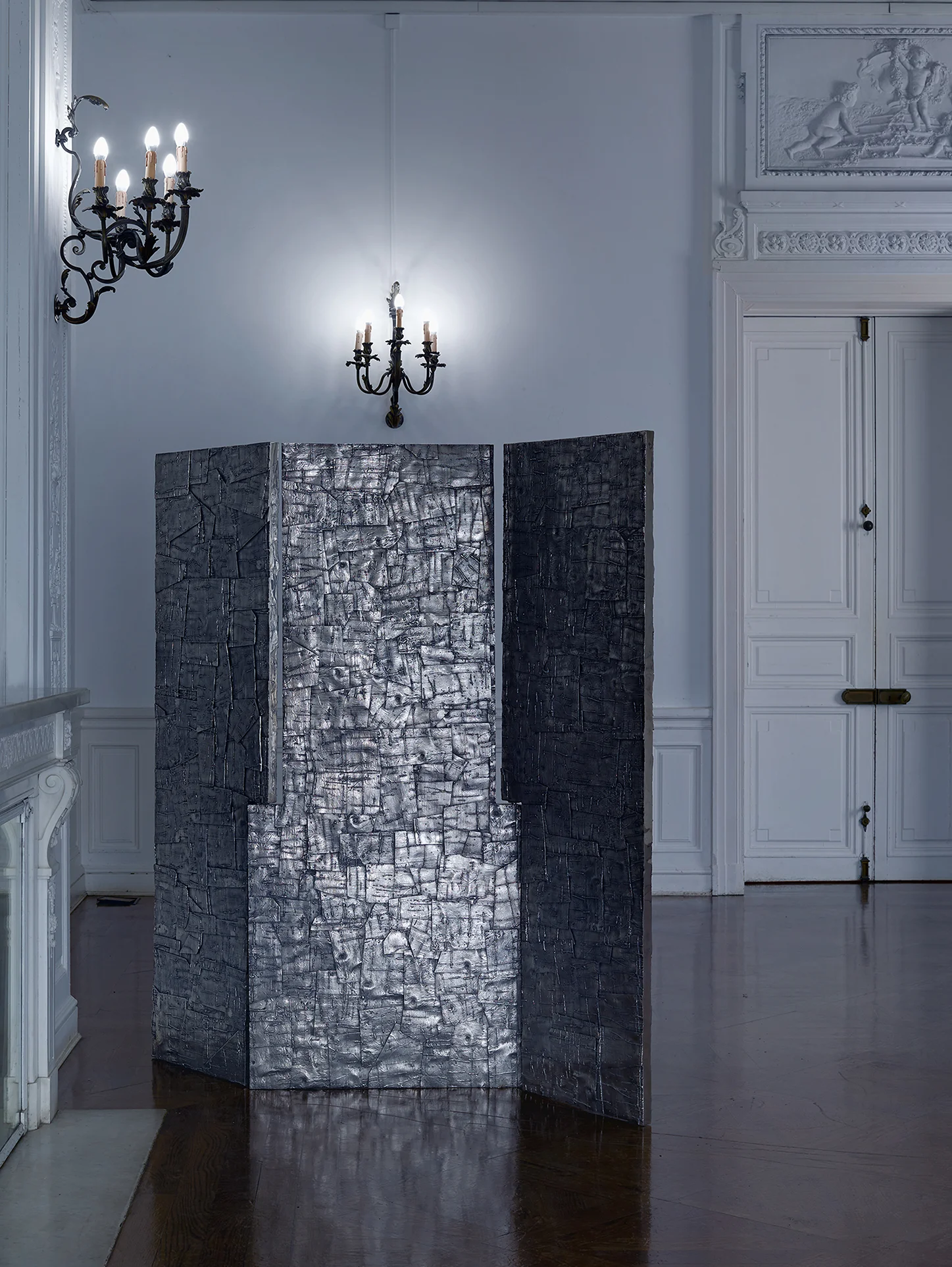 Su estructura, desarrollada en acero inoxidable, se caracteriza por una composición precisa de planos que generan ritmo, transparencia y profundidad. La pieza no bloquea el espacio, sino que lo filtra, permitiendo una relación dinámica entre las distintas áreas.